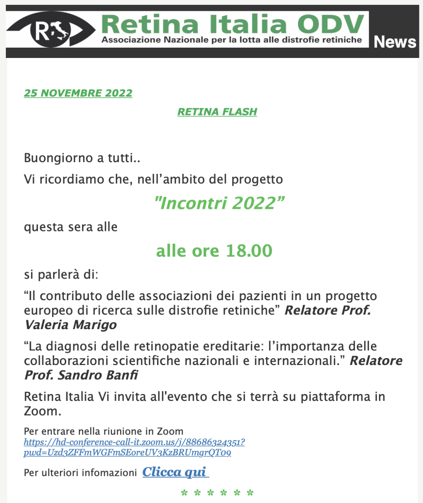 Progetto Retina Italia ODV “Incontri 2022” – November 25, 2022 – held virtually on Zoom Meet platform